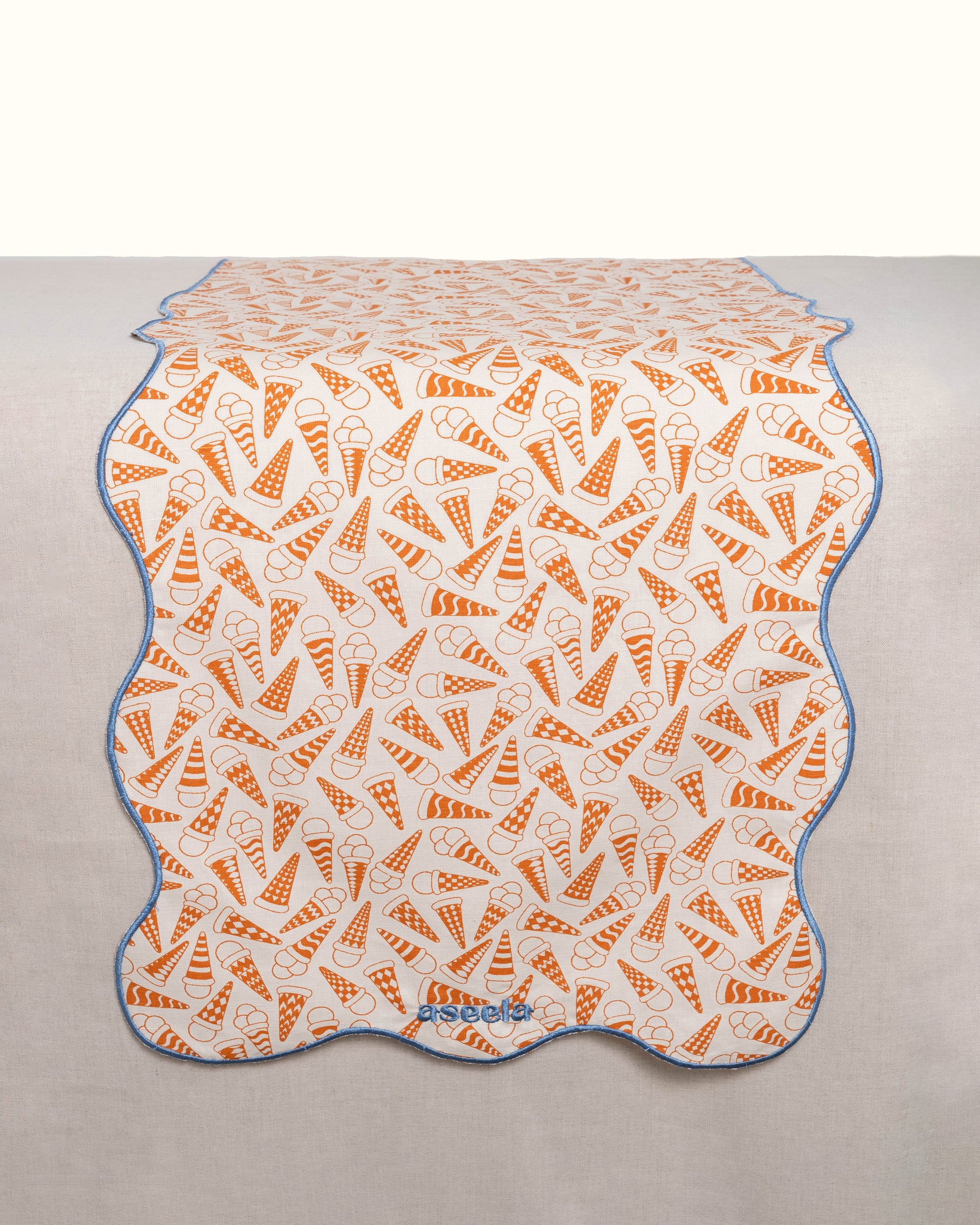 Our wavy Gilaty runner, with embroidered edges brings a soft, elegant flow to any table.