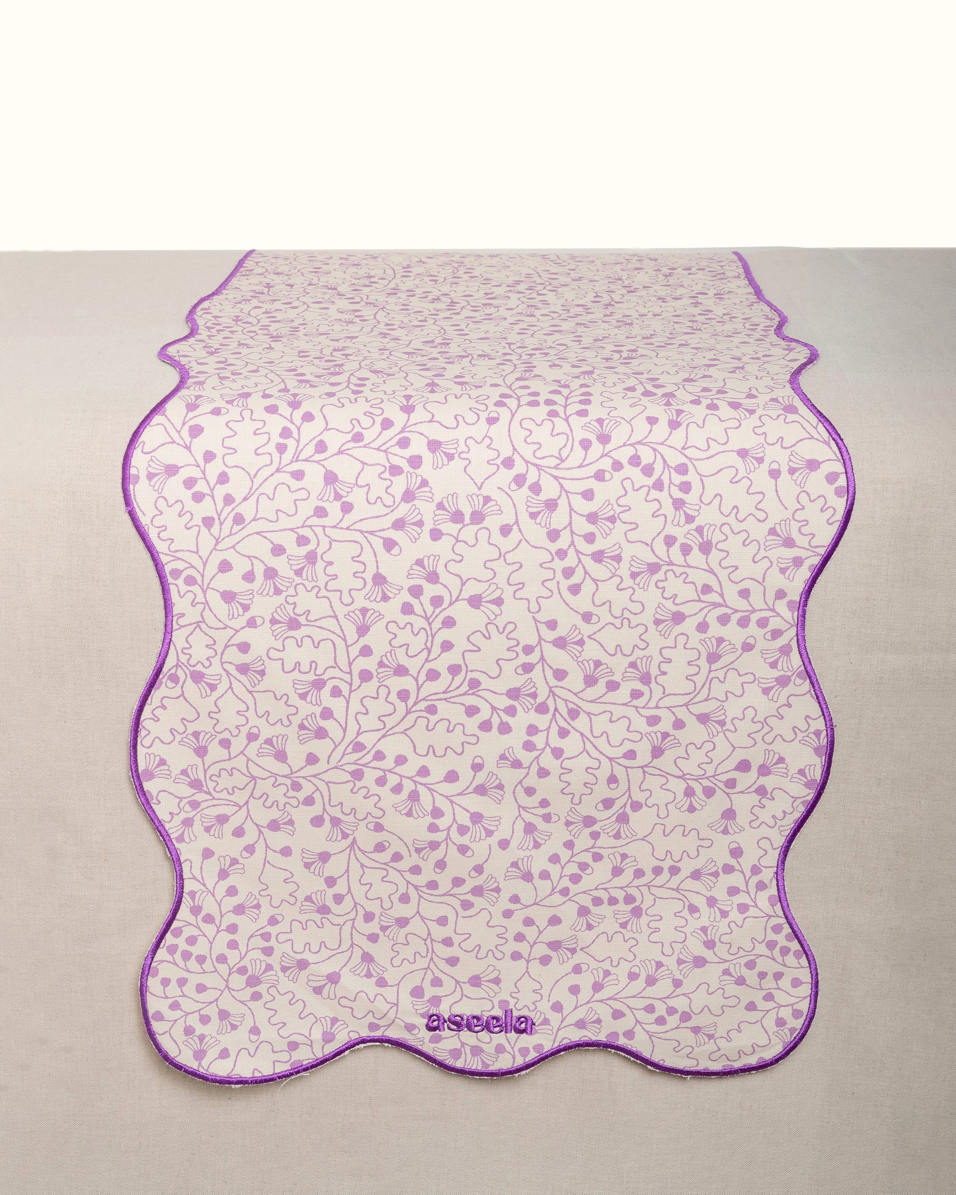 Our wavy Sard runner, with embroidered edges brings a soft, elegant flow to any table.